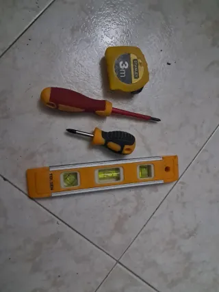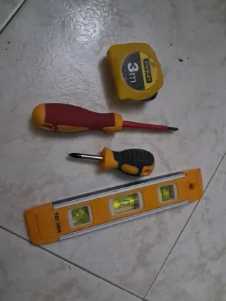 Lote de herramientas variadas para tus proyectos. - Nivel de burbuja Tolsen. - Cinta métrica Stanley de 3m. - Dos destornilladores de diferentes tamaños.