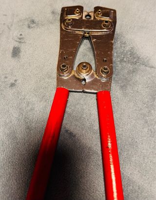Herramienta para crimpar terminales. - Mangos de color rojo con empuñaduras negras. - Cabezal metálico plateado.