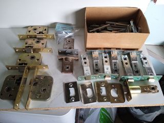 Lote de picaportes y cuadradillos para puertas. Incluye varios mecanismos y placas. 5 picaportes de 3,5 centro aguja caja de 7 cm sin placas para marco 8 picaportes tubolares para cambio pomos por manetas con placas para marco 3 picaportes antiguos dos de 3,5 y uno de 4,5 - Mecanismos de picaporte metálicos. - Placas de acero inoxidable. - Cuadradillos de diferentes tamaños.