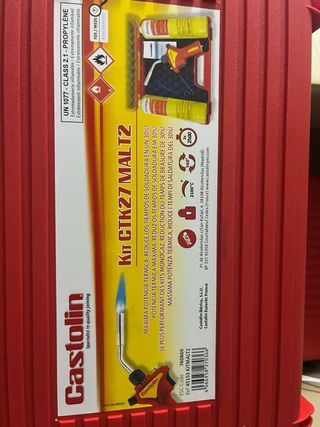 Maletín Castolin CTK27 MALT2 con soplete y dos botellas de propileno. - Incluye soplete y 2 botellas de propileno. - Potencia térmica máxima. - Reduce tiempos de soldadura. - Temperatura de 2100°C. - Uso continuo de 2h00.