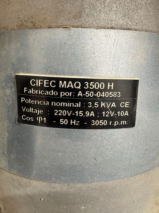 Grupo electrógeno CIFEC MAQ 3500 H. - Fabricado por A-50-040583. - Potencia nominal: 3,5 KVA CE. - Voltaje: 220V-15,9A ; 12V-10A. - Cos φ1 - 50 Hz - 3050 r.p.m.