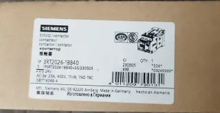 Contactor Siemens 3RT2026-1BB40. - Modelo: 1P 3RT2026-1BB40 - Bobina: 24V - AC-3e: 25A, 400V, 11kW - Contactos: 1NO 1NC - Fabricado en Alemania