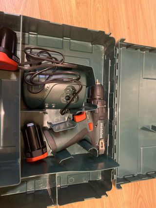 Se vende taladro atornillador Metabo de 12V, ideal para trabajos en casa o profesionales. - Incluye taladro Metabo. - Dos baterías de 12V. - Cargador de batería. - Maletín de transporte.