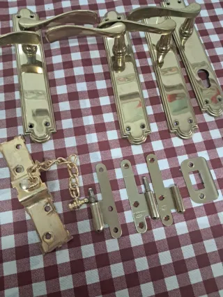 Conjunto de cinco manetas doradas para puertas, con un diseño clásico y elegante. - Material: Latón dorado. - Incluye placas y accesorios. - Estilo vintage.