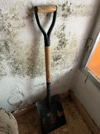 Set de pala y cubo para trabajos de construcción. - Pala con mango de madera y D-grip. - Cubo de plástico resistente.