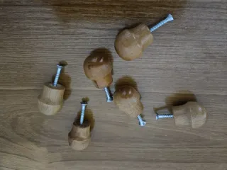 Conjunto de seis pomos de madera para muebles. Son ideales para dar un toque natural y cálido a tus armarios, cajones o puertas. - Fabricados en madera. - Diseño sencillo y versátil. - Incluye tornillos para su instalación.
