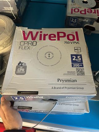 Se vende cable eléctrico Prysmian WirePol CPRO FLEX. Tengo 3 bobinas de cable azul, tierra y negro. Por separado, 80 euros. En su caja original. - Modelo: CPRO FLEX - Marca: WirePol - Voltaje: 750 V - Material: PVC - Sección: 2.5 mm² - Longitud: 200 m - Certificación: CE CPR COMPLIANT
