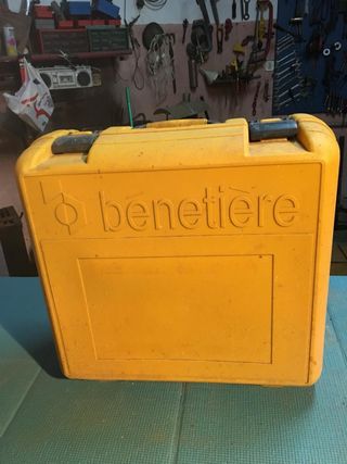 Maletín de plástico resistente en color amarillo, con el nombre de la marca Benetière grabado. Para corta baldosas con precicision. Se entrega completo, con disco, llaves y instrucciones de uso - Asa superior para transporte. - Cierre de seguridad. - Diseño robusto.