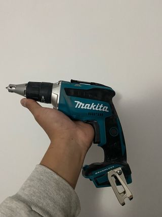 Atornilladora de la marca Makita, modelo DFS452Z. Se ha usado solo 4 veces. Motor sin escobillas (BL) de 18V para mayor eficiencia y duración. Velocidad de 0 a 4000 RPM. Tecnología "Push Drive" que activa el motor solo al entrar en contacto con la superficie, ahorrando batería. Diseño compacto y ergonómico con luz LED integrada. Gancho para cinturón y botón de bloqueo para atornillado continuo.