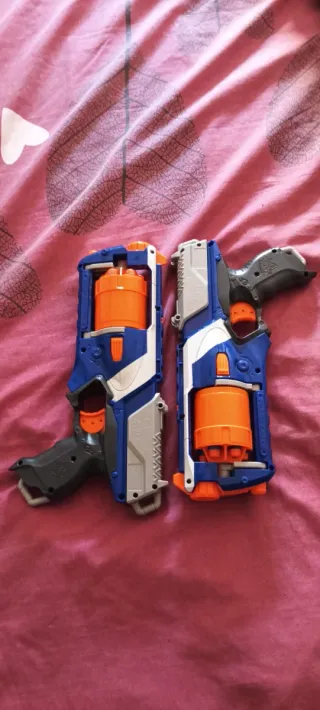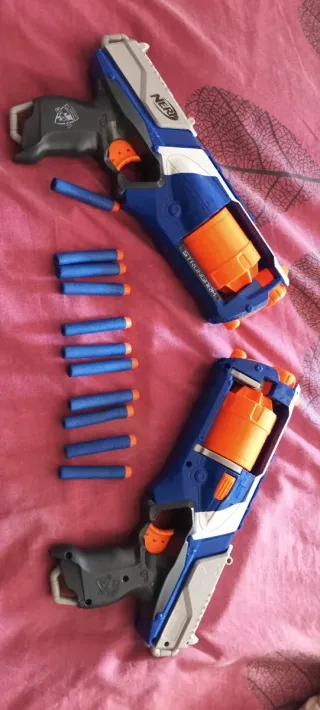 Se venden dos pistolas Nerf junto con 11 dardos. - Incluye dos pistolas Nerf. - Incluye 11 dardos de espuma. - Color azul, blanco y gris.