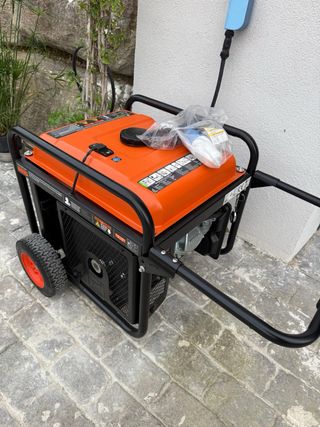 Generador eléctrico GENERGY CRETA RC en color naranja y negro. Ideal para diversas aplicaciones. - Diseño portátil con ruedas. - Panel de control con enchufes. - Marca: GENERGY. - Modelo: CRETA RC.