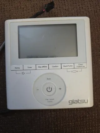 Control cableado Giatsu – Panel de pared con cable Vendo panel de control cableado original para aire acondicionado Giatsu. La unidad está en buen estado físico, con pantalla grande y botones funcionales. Incluye cable de conexión, aunque está cortado, por lo que el comprador deberá empalmarlo o sustituirlo (fácil para instaladores o técnicos). Ofrece funciones como: • Swing • Timer • Day off/Del • Confirm • Back/Turbo • Copy/Follow me • Control de modo y velocidad del ventilador Estado: Uso normal, con señales de desgaste. Cable incluido. Ideal como recambio económico para unidades interiores Giatsu.