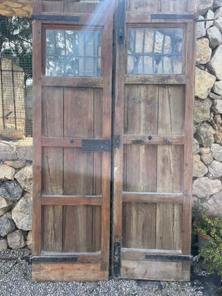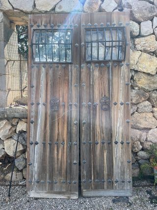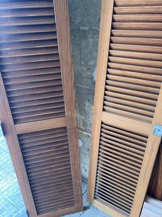 Preciosa pareja de persianas mallorquinas de color verde. Ideales para dar un toque rústico a tu hogar. - Color verde oscuro. - Madera maciza. - Dos hojas. Cada hojamide 60x200 cm, es decir, cada conjunto 120x200cm