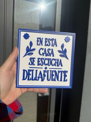 Azulejo En esta casa se escucha Dellafuente impreso en 3D. Material: plástico PLA Precios: - 20x20 cm: 15€ - 15x15 cm: 10€ Pídelo tambien con un nombre y color personalizado. Se puede añadir un soporte como el de la imagen por 2€ más.