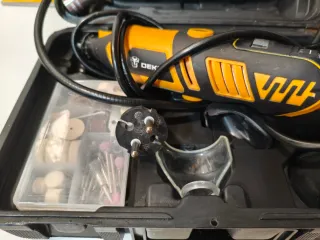 Mini herramienta rotativa DEKO, ideal para trabajos de precisión y bricolaje - Incluye varios accesorios para lijar, cortar, pulir, grabar, limpiar óxido o trabajar madera metal y plástico. Lleva un eje flexible para herramienta rotativa. - Diseño compacto y ergonómico. - Viene con su estuche para guardarla.
