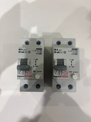 Se venden dos interruptores diferenciales Legrand de 40A y 30mA. - Marca: Legrand - Modelo: 6060 94 - Voltaje: 230V~ - Corriente nominal: 40A - Sensibilidad: 30mA - Poder de corte: 6000 Precio por unidad 15€ Los fos 25€