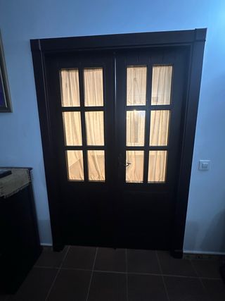 Puerta de dos hojas de madera maciza oscura, con cristales y cortinas. - Diseño de dos hojas. - Marco de madera oscura. - Paneles de cristal con cortinas blancas. - Hojas de 60cm cada una.
