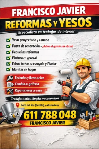 Ofrezco servicios profesionales de reformas y trabajos de yeso. - Yeso proyectado y a mano - Pasta de renovación - Pequeñas reformas - Pintura en general - Falsos techos de escayola y Pladur - Manitas del hogar - Enchufes y llaves de luz - Cambio de grifería - Reparaciones en casa - Trabajos serios, limpios y económicos - Lora del Río (Sevilla) y alrededores
