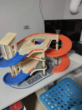 Divertido parking de madera de varios niveles para jugar con coches. - Construcción de madera. - Rampas de acceso. - Diseño de garaje de varios pisos.