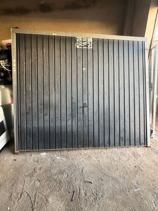 Puerta de garaje de color negro, con un diseño de lamas verticales y marco metálico. 2’75/2’30 - Diseño de lamas verticales. - Marco exterior metálico.