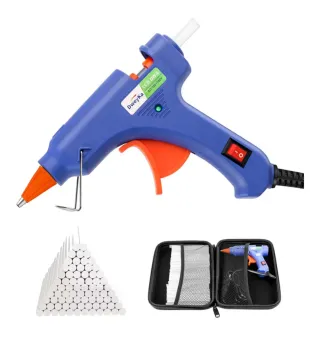 Pistola de silicona Dweyka en color azul y naranja, con soporte metálico. Incluye un paquete de 100 barras de silicona y una funda de transporte. - Pistola de silicona Dweyka. - Color: Azul y naranja. - Soporte metálico. - 100 barras de silicona. - Funda de transporte. 0120