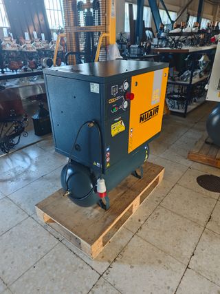 Compresor de aire Nuair Air Sil HP3, conocido por su funcionamiento silencioso. Diseñado para ofrecer un rendimiento eficiente. - Modelo: Air Sil HP3 - Marca: Nuair - Tipo: Compresor de aire silencioso - Color principal: Naranja y gris oscuro - Montado sobre palet de madera para transporte seguro.