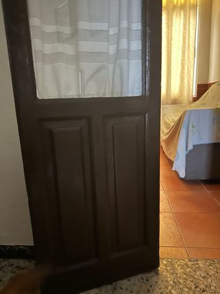 Puerta de interior de madera oscura con paneles de cristal. - Diseño clásico con tres paneles de cristal. - Marco de madera robusto. Se venden ambas, para medidas pregunten. Pueden pasar a verla.
