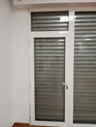 Ventana de balcón de aluminio blanco con persiana enrollable. - Marco de aluminio blanco. - Tres paneles de vidrio con persiana. - Puerta con manilla. Medidas: 2’30m de alto y 80 cm de ancho Se pueden ver en persona
