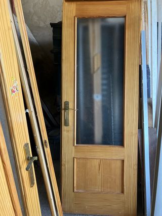 Puertas interiores de madera para vivienda de 203cm de alto. (30€ cada puerta) Incluyen marco y tapetas. -1 puerta con cristal de 72cm -1 puerta doble con cristal de 72 y 42cm (cristal de 72 rajado) - Material: Madera - Color: Natural - Acabado: Barnizado