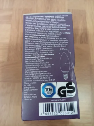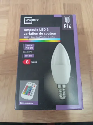 1 unidad 3.50€ 10unidades 30€ 20unidades 50€ Bombilla LED Livarno con opción de cambio de color y control remoto. - Tipo de casquillo: E14 - Potencia: 3W (equivalente a 25W) - Flujo luminoso: 250 lm - Temperatura de color: 3000 K (blanco cálido) - Ángulo de haz: 360° - Voltaje: 230V - 50 Hz - Clase energética: G BOMBILLA LED LIVARNO HOME E14 CAMBIO DE COLOR 3W Descripción: Producto original de valor completo. Sellado de fábrica. Datos técnicos: Vida útil: aprox. 30.000 h Número de ciclos de funcionamiento: 100.000 x encendido/apagado Conexión: Zigbee 3.0 Características especiales: regulable