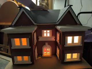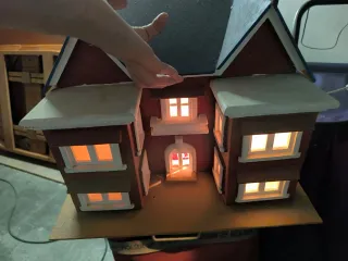 Casa decorativa de marquetería con detalles de madera y pintura. - Ventanas iluminadas. - Diseño de dos plantas. - Tejado a dos aguas.