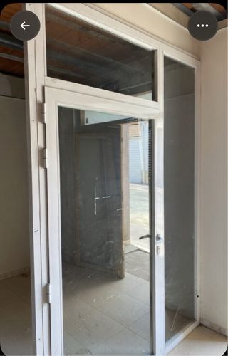 Mampara de aluminio con cristal y puerta de tienda. - Marco de aluminio blanco. - Cristal con franjas decorativas. - Puerta con manilla plateada. Es la entrada entera de un negocio la puerta es de 0,90 + 0,46 fijo y el fijo grande es de 2,34. La altura es 2,30 mt .