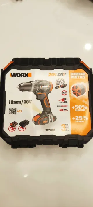 Taladro percutor inalámbrico WORX de 20V. - Incluye 2 baterías de 2Ah. - Motor Brushless. - Mandril de 13mm. - Mayor tiempo de uso y potencia. - Cargador rápido 1 hora. - 1 Punta de atornillar doble. - 1 estuche de 30pzs de brocas y puntas. - 1 Clip de sujeción cinturón. - Maletín de transporte Está nuevo,no se ha utilizado.
