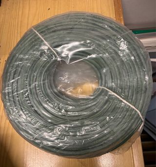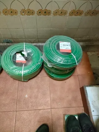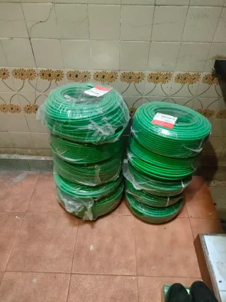 Manguera eléctrica de color verde, ideal para diversos usos. - Medidas: 5x16mm. - Longitud: 46 metros. Libre de alógenos, me costo 800€ se coloco y se saco por equivocación de medida esta sucia de haberla metido por el tubo