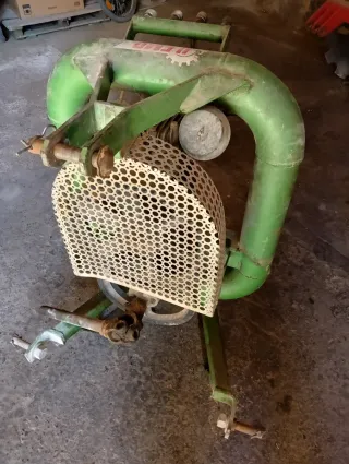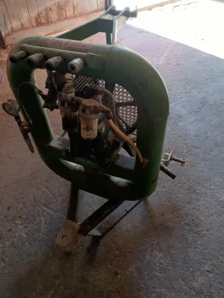 Compresor de aire de color verde, con una estructura metálica y una rejilla protectora.. Con mangueras y tijeras neumaticas incluidas..