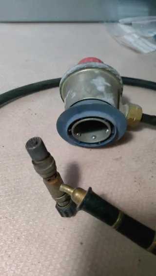 Manguera para soplete con regulador y manómetro. - Manguera de goma negra. - Regulador de presión. - Manómetro con escala. - Boquilla de soplete.