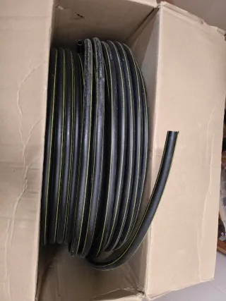 Manguera de gas enrollada en su embalaje original. - Color negro con dos rayas amarillas. - Material flexible y resistente. - Especial para gas - Multicapa gas 16x2 - Son 40 metros lo que hay