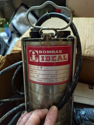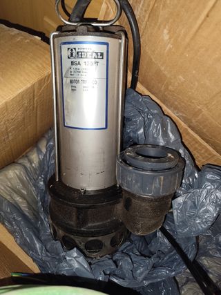 Bomba de agua sumergible marca IDEAL, modelo BSA 120 P. - Tipo: Trifásica - Potencia: 1,5 CV - Voltaje: 380 V - Frecuencia: 50 Hz - Revoluciones: 2.900 r.p.m. -Impulsor vortex, puede absorber sólidos de hasta 5cm. También tengo cableado y mangueras si se necesita.