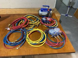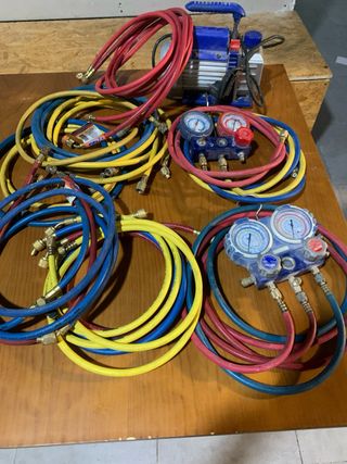 Conjunto de manómetros y bomba de vacío para sistemas de aire acondicionado. - Manómetros con mangueras de colores (rojo, azul, amarillo). - Bomba de vacío azul con asa.
