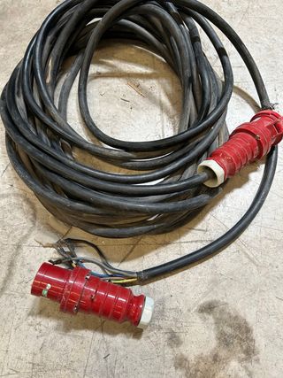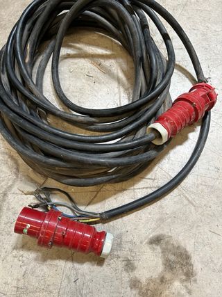 Manguera de conexión trifásica con 5 polos y capacidad de 63 amperios. Ideal para aplicaciones industriales o de alta demanda eléctrica. - Conector de 5 polos. - Capacidad de 63A. - Cableado robusto para uso intensivo. 30 metros utilizado solo dos veces