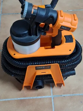 Máquina de pintar TACKLIFE con manguera y depósito. - Color naranja y negro. - Manguera negra corrugada. - Depósito blanco con tapa negra.
