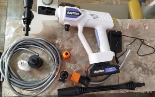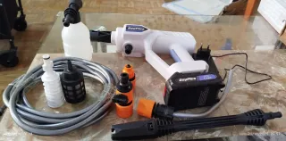 Pistola hidrolimpiadora de alta presión de la marca DayPlus, ideal para diversas tareas de limpieza. - Incluye una batería de 21V 1.5Ah. - Viene con cargador. - Incluye manguera y varios accesorios para diferentes tipos de boquillas ajustable de 180°