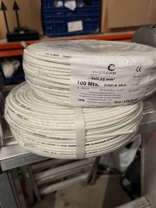 2 Rollo de cable Phercab de 100 metros con 4 conductores de 0,22 mm². - Modelo: Z1OZ1-K APLH. - Clasificación reacción al fuego: Cca-s1b,d1,a1. - Cumple normativa EN-50575:2014+A1:2016.