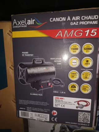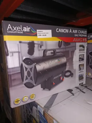 Cañón de aire caliente a gas propano marca Axelair, modelo AMG15. Ideal para calentar espacios de forma rápida y eficiente. - Potencia de 15000 Watt / 52000 BTU. - Consumo de 1,09 kg/h. - Ventilador integrado de 230V. - Encendido piezoeléctrico. - Incluye regulador de gas y manguera de 1,50 m. - Peso: 3,8 kg.