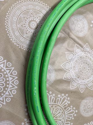 Manguera eléctrica/ línea eléctrica/ cable eléctrico 5x25mm enrollada. Tiene 10 metros lineales. - Color verde. - Sujeta con cintas blancas.