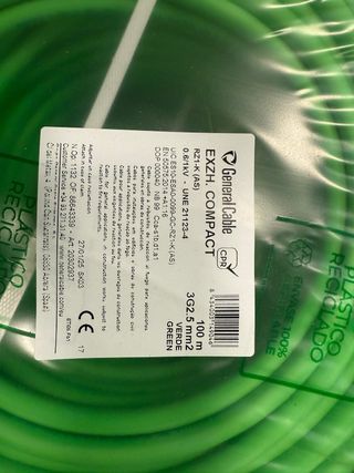 Manguera 3X2,5 General Cable EXZH Compact. - Color: Verde - Sección: 3G2.5 mm2 - Longitud: 100 m - Tensión nominal: 0.6/1kV - Cumple norma UNE 21123-4 - Clasificación CPR: Cca-s1b,d1,a1 - Fabricado en España Fabricacion nacional una de las mejores del mercado precio no negociable.