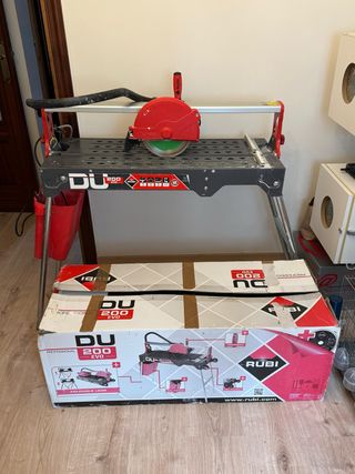 Cortadora eléctrica Rubi DU-200 EVO con motor de 650W. Ideal para cortes precisos muy Poco uso. Con todos sus accesorios. - Disco de corte de 200 mm. - Patas plegables para fácil transporte y almacenamiento. - Incluye manguera para refrigeración por agua. Características: • Longitud de corte: 65 cm • Disco diamante: 200 mm • Altura de corte: hasta 35 mm • Cabezal abatible 45° • Depósito de agua extraíble • Patas plegables • Uso profesional para obra y reformas