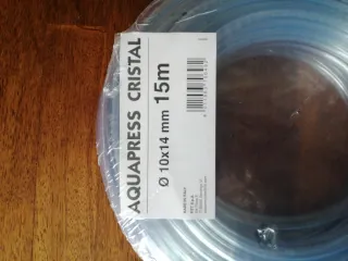 Manguera de PVC transparente para agua. - Marca: Aquapress - Modelo: Cristal - Diámetro: 10x14 mm - Longitud: 15 metros