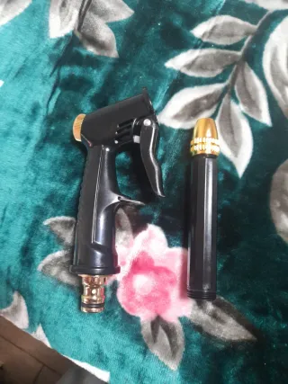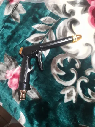 Pistola de presión con un diseño ergonómico y acabado en negro con detalles dorados. - Cuerpo principal de plástico resistente. - Gatillo metálico. - Boquilla ajustable dorada. - Conexión para manguera en la base. Totalmente nueva. Visita mi perfil que tengo muchas cositas variadas y a buen precio.