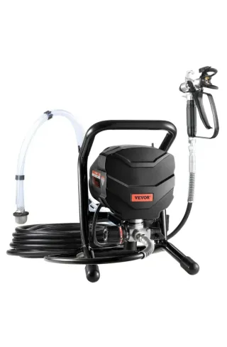 Máquina de pintura de la marca VEVOR. Su diseño es compacto y robusto, con un asa superior para facilitar su transporte. - Color principal: negro. - Incluye manguera de succión.